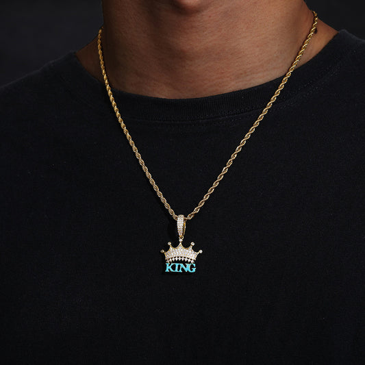18K Iced Out Cold Enamel Made Luminous KING Crown Pendant Chain Necklace