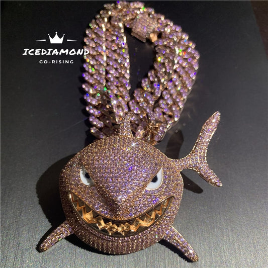 18K Fancy Pink Shark Pendant & Iced Out Cuban Chain Necklace