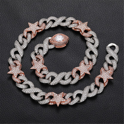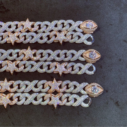 Eye-catching & high-heat Infinity symbol Cuban chain stitching stars and Horus' eye design diamond buckle. 16''/18''/20'' iced out bright CZ diamonds hip hop chain necklace will make you look fashionable and charming.